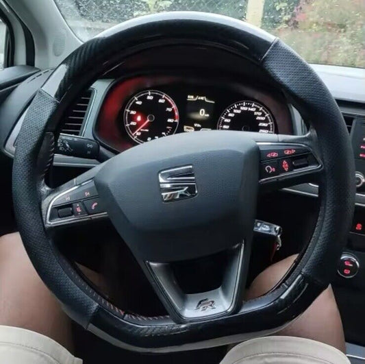 38cm D Black PU Leather & Carbon Fibre Effect Steering Wheel Cover Universal Fit