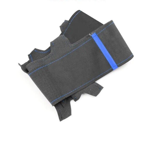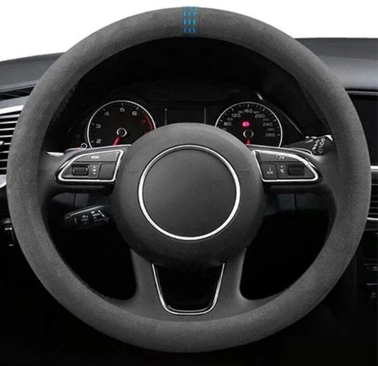 38cm Black Suede Steering Wheel Cover With Blue Centre Line Marker Universal Fit