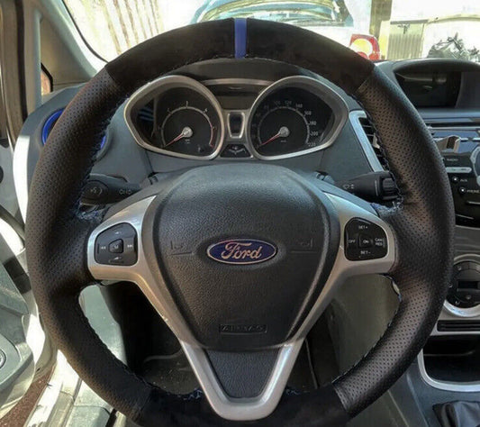 Ford Fiesta MK7/7.5 Black Suede Leather Steering Wheel Cover Blue Thread & Line