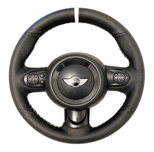 Mini Cooper R56 R57 Black Leather Steering Wheel Cover White Thread Self Stitch